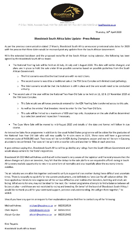 Bloodstock SA CEO Michael Holmes said that while the board is very aware of the logistical and financial pressure that the above changes will place on breeders, they felt that the delays to the sale platform are required to afford racing in South Africa every realistic opportunity to return to some form of normality and also hopefully allow the economy time to stabilize.