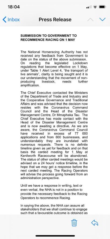 The Chief Executive contacted the Ministers of the Department of Trade and Industry and the Cooperative Governance and Traditional Affairs and was advised that the decision now resides with the Coronavirus Command Council and the Head of the Disaster Management Centre, Dr Mmaphaka Tau. The Chief Executive has made contact with the Head of the Disaster Management Centre and is now awaiting a directive. As we are aware, the Coronavirus Command Council have received in excess of 77 000 applications and from 800 businesses, and understandably they are inundated with numerous requests. There is no definite timeline given as yet for feedback and on that basis the carded meeting for 1 May at Kenilworth Racecourse will be abandoned. The status of other carded meetings would be advised on a 24 hours’ notice timeline, in the hope that we may get a response before the next carded meeting. The Racing Operators will advise the process going forward from an administration perspective.