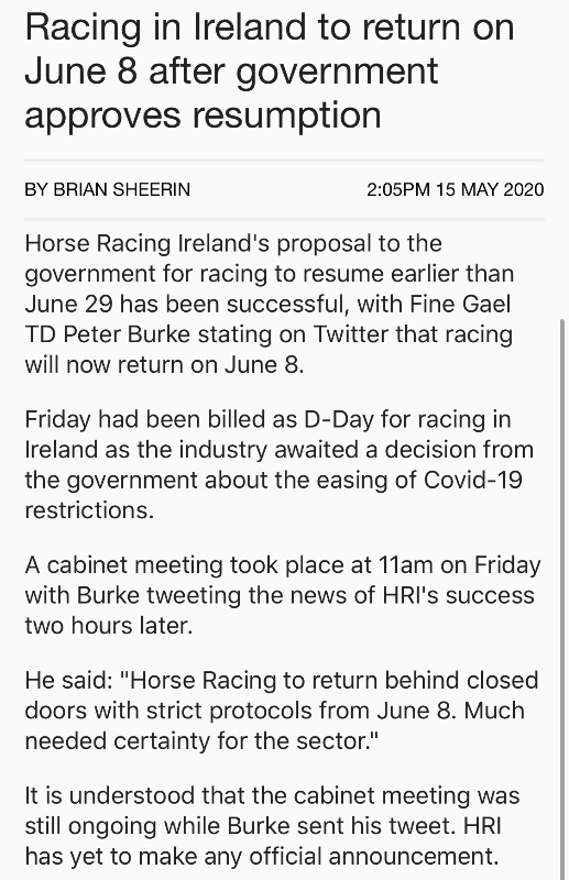 Racing in Ireland to resume June 8