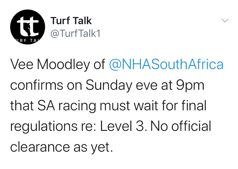 Having listened to the President's speech again, must say i don't think racing will be starting next week as most hoped.