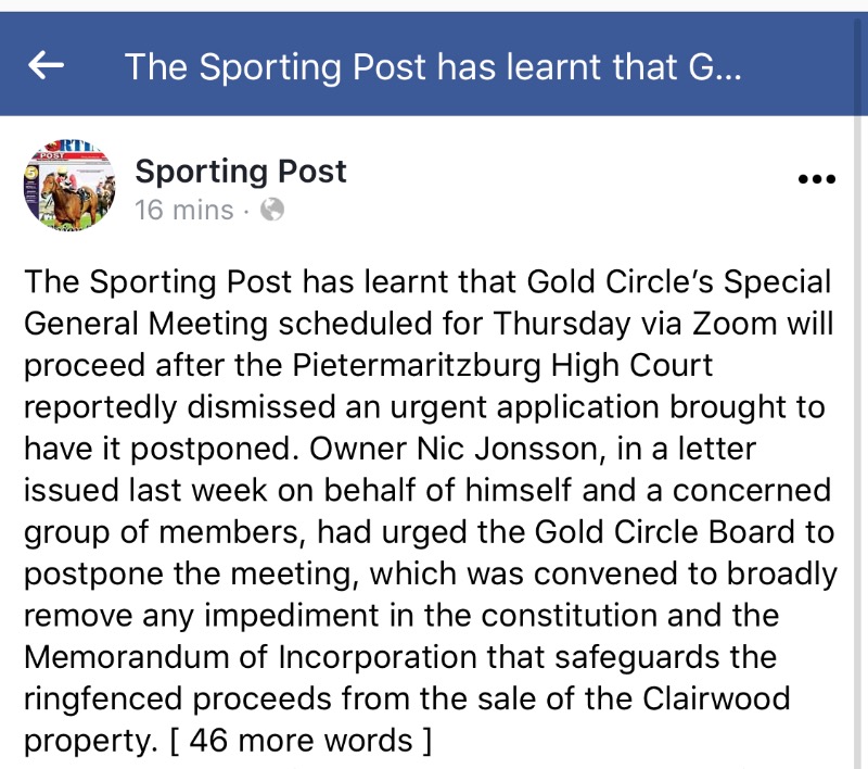 As reported by Turf Talk last Saturday, Jonsson’s actions follows the convening of a Special Gold Circle General Meeting this coming Thursday, 18 June, to be held via the electronic meeting platform Zoom, at which the Board will be asking members to remove any impediment in the constitution and the Memorandum of Incorporation (MOI) that safeguards the ring-fenced funds from the sale of the Clairwood property. The ringfenced amount is said to be R242-million.