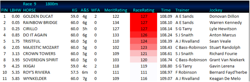 GOLDEN DUCAT has had his rating raised from 122 to 128 after he wore down his stable companion and older half-brother RAINBOW BRIDGE to snatch a narrow win in the Grade 1 World Sports Betting Champions Cup (Weight For Age) over 1800m at Greyville on Saturday. The Handicappers of the view that the ultra-game 3rd placed CIRILLO made for the most suitable line horse, and he accordingly remains unchanged on 127.