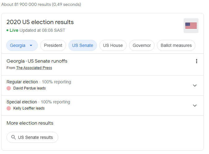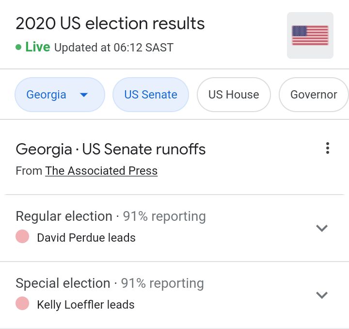 5 years 3 months agoThis is my very point, Kelly Loeffler has lost to Warnock, and Perdue and Ossoff are going neck-and-neck, Perdue slightly ahead, but the votes are still coming in.