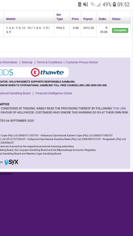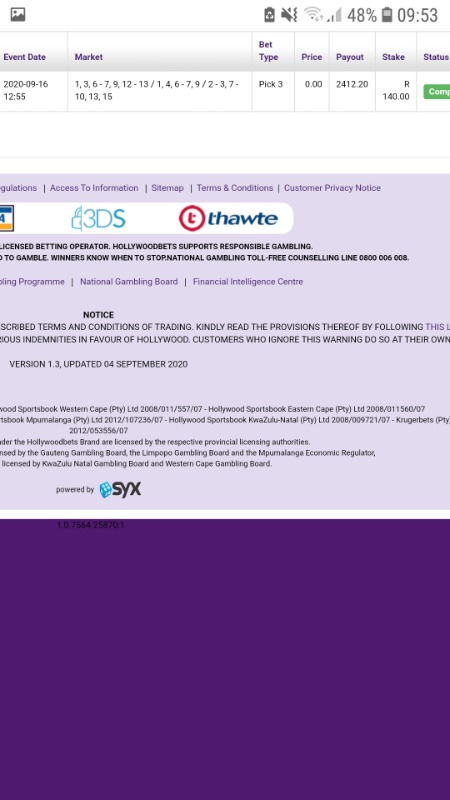 Yes Hollywood and other bookies offer Pick 3's as well for percentages as well. In fact the Pick 3 has been very good to me. The biggest Pick 3 payout I have collected for a single unit is R17,000 odd. See attached, two Pick 3's perms taken for 50% collecting R4800 on Wednesday for Greyville. I have scooped the pool on numerous occassions.