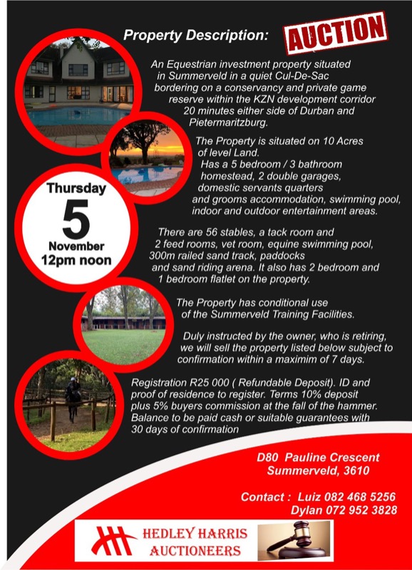 Property Description: an equestrian investment property situated in Summerveld in a quiet cul-de-sac bordering on a conservancy and private game reserve within the KZN development corridor, 20 minutes either side of Durban and Pietermaritzburg.