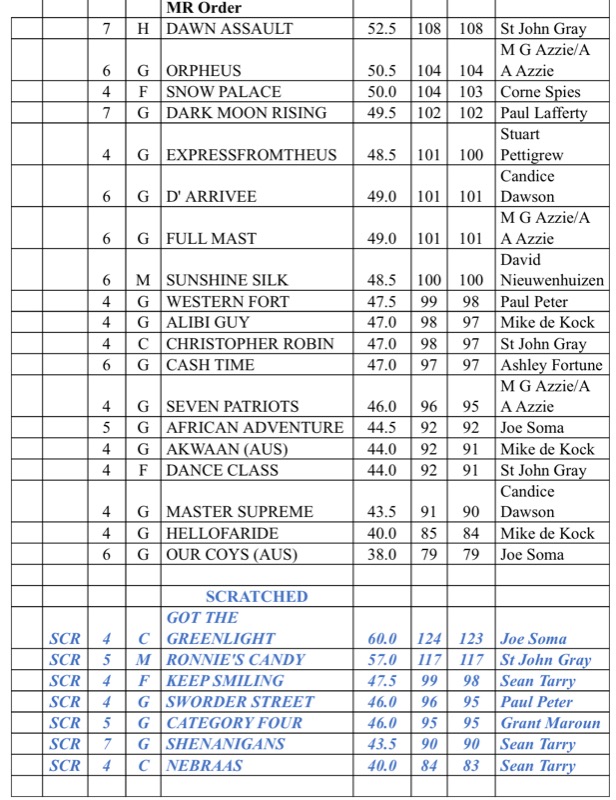 Other withdrawals are Ronnie’s Candy (St John Gray), Keep Smiling, Shenanigans and Nebraas, all from the Sean Tarry yard, Sworder Street (Paul Peter) and Category Four (Grant Maroun)