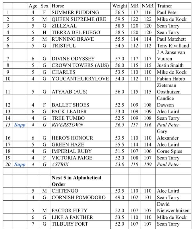 There were two runners supplemented into the field for the R1-million World Sports Betting Gauteng Summer Cup on Monday, but there were also seven runners withdrawn from the Grade 1 race over 2000m at Turffontein on Saturday 28 November.