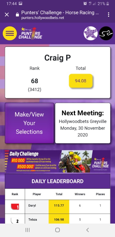 There is R10,000 up for grabs for the Top 20 in today's Hollywoodbets Punters Challenge! Take your picks now before the cutoff which is 12:25! Visit