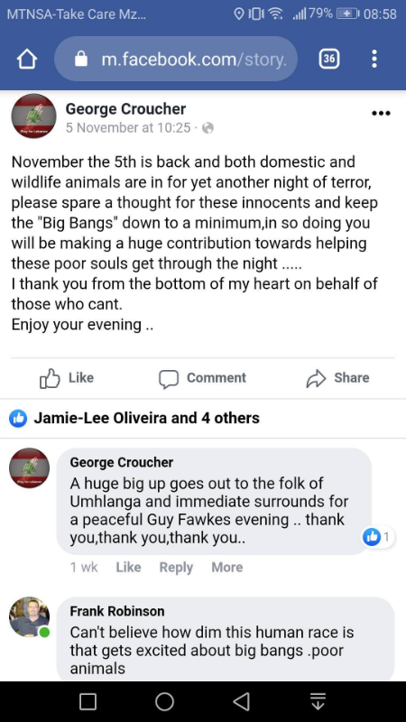 Durbs the Reference to George Croucher in the reply is purely showing that the message was in response to the thread that i opened on FB asking for folk to consider the animals when celebrating last night and does not reflect my views in ANY way...