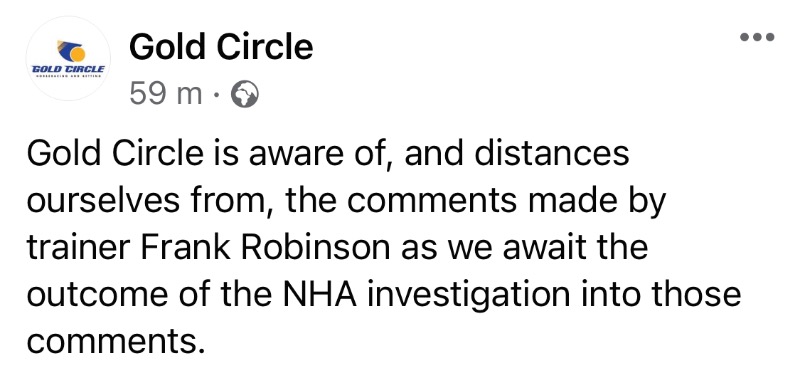 5 years 5 months agoGold Circle is aware of comments attributed to a KZN-based trainer on social media and disassociates itself from those comments which in no way reflect the views of Gold Circle. The company does not tolerate any form of racial discrimination and whilst the NHA conducts an investigation into this matter, Gold Circle will be doing their own investigation and deciding on an appropriate course of action.