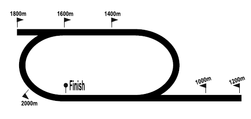Race Track: Turf. 2300m oval circuit. Races up to 1200m straight course; beyond 1200m clockwise round turn with 550m run-in. There are inside and outside tracks in races beyond 1200m with a common back straight and turns. The outside track joins the 1200m straight course at the 550m mark, while the inside track has its own run-in.