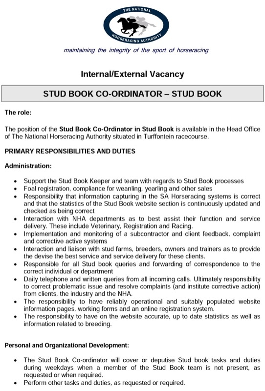 assist the RAE/ stud book keeper with any other adhoc duty which may be given from time to time.