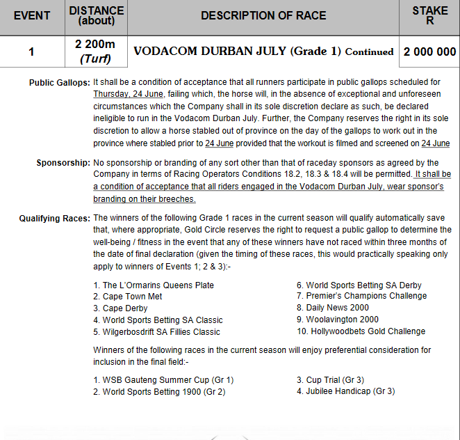 Securing a berth in the 18-horse field for this year’s Gr1 R2 million Vodacom Durban July will be a scrap to final acceptances on Monday, 21 June with 54 names on the list at first entries yesterday.