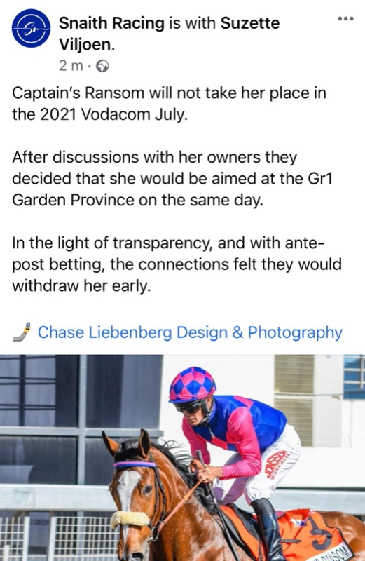 Bob Brogan wrote: Malmoos being scratched from the Durban July tomorrow