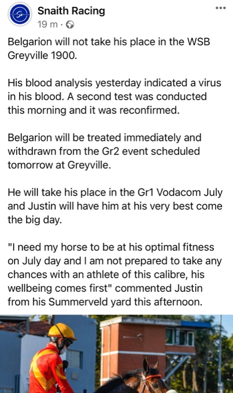 In spite of top weight, Belgarion is still well treated when he contests the Gr2 WSB 1900 at Hollywoodbets Greyville on Sunday, May 16, one of the important warm-up races for the Gr1 Vodacom Durban July to be run on Saturday, July 3.