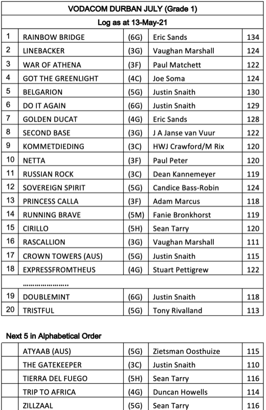 South Africa’s highest rated race horse, Rainbow Bridge, heads the 2021 Vodacom Durban July log which was issued by racing operator Gold Circle today.