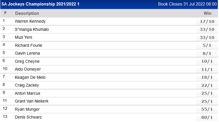 Warren the one to beat but my fancy is bling. If this oke puts his mind to the job its race over. Yeni in with a chance but I think all this long seasons he has been having will catch him out this year