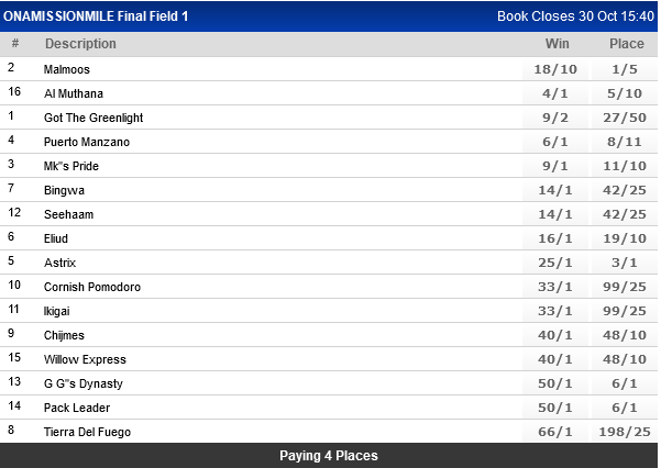 Got The Greenlight, Malmoos and MK’s Pride head up this Grade 2 race over 1600m on the Standside track and they are ably supported by the likes of Al Muthana, Puerto Manzano, Astrix and Bingwa, with a full field of 16 acceptances.