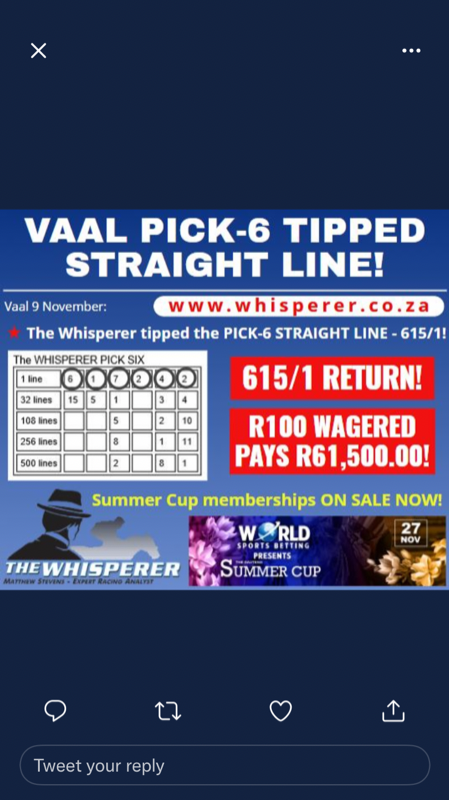 Vaal worker riders meeting, all eight races the favourite either won or ran second. Most punters made money imo. Some may say horse ran to form, imo it was pure unadulterated riding to win with no outside influence.
