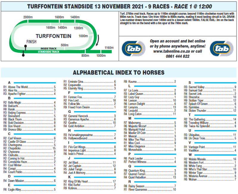 TURFFONTEIN STANDSIDE SATURDAY NOVEMBER 13 FOR GUIDES, SELECTIONS, PERMUTIONS
