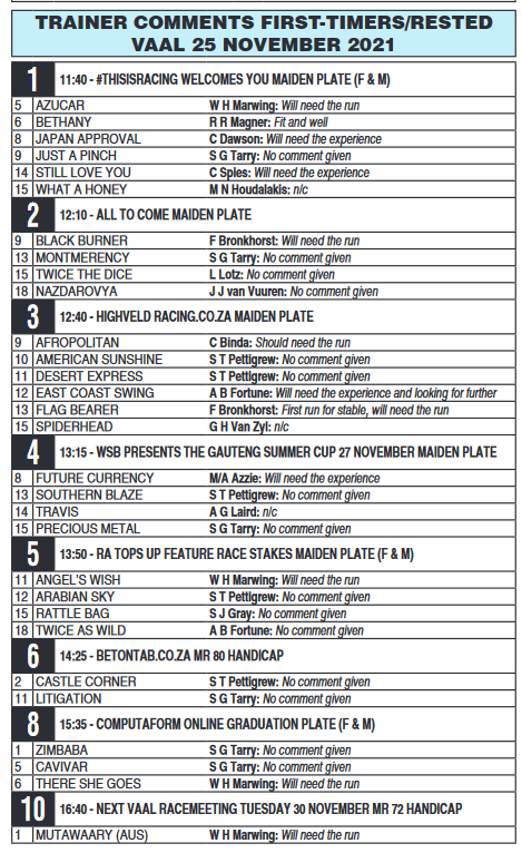 The Vaal hosts Thursday's South African racing action.