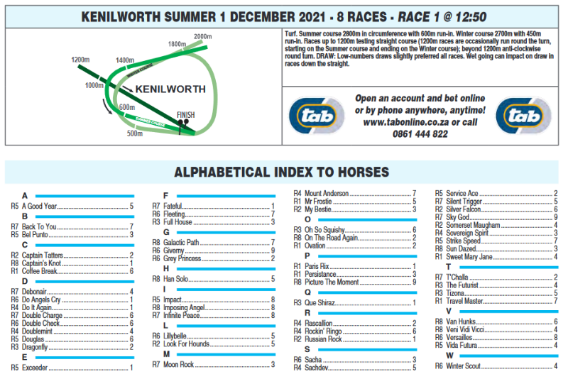 Race Track: Turf. Summer course 2800m in circumference with 600m run-in. Winter course 2700m with 450m run-in. Races up to 1200m testing straight course (1200m races are occasionally run round the turn, starting on the Summer course and ending on the Winter course); beyond 1200m anti-clockwise round turn.