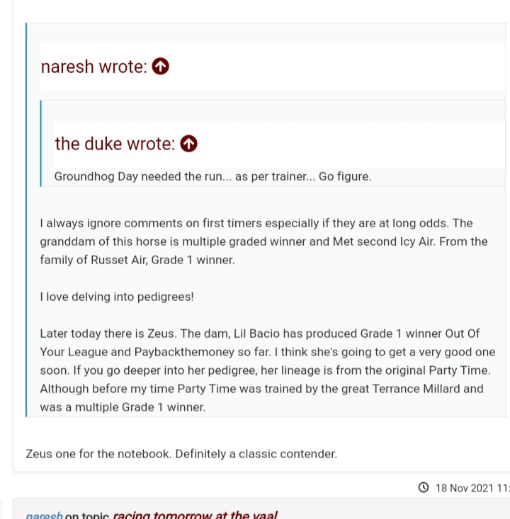 ......saw that and the spiel that someone at SP done on the dam.....but peeling back in the ped cannot see where the genome comes from.....was very big on Trademark back in the day but then knew nothing about pedigree and genome and see him as an anomaly.... but that genome is strong as Zeus is the 3rd of 4 siblings so far showing above average over ground and now the younger sister also cracked her maiden over 1900m in KZN.....there is no 3yrold as the mare slipped foal.... but was since covered by Erupt with a now 2yr old colt in the wings.....this could be the mare's last.....