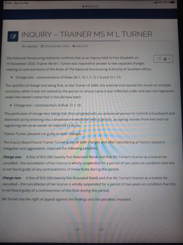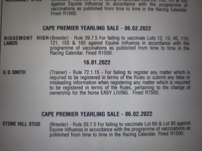 ownership for the horse EASY LIVING. Fined R7500