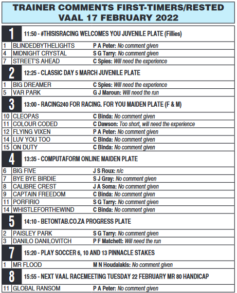 Re: VAAL, Thursday 17 February