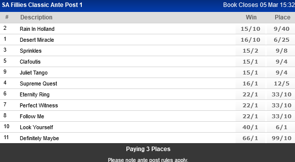 with Desert Miracle, who started at 1-3 for the Gauteng Fillies Guineas, at 16-10.