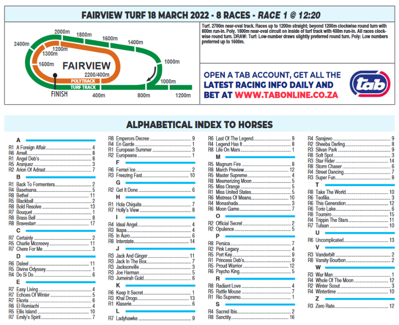 4 years 1 month agoFAIRVIEW TURF FRIDAY MARCH 18 SELECTIONS, PERMUTATIONS BY DEVONNE GOVENDER