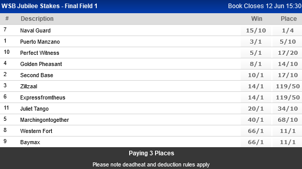 As far as Naval Guard goes (who somehow is in the A/P betting at 25s :huh: ), I think he has even less chance than Airways Law to make the July field; he is also way out at the weights and the Jubilee does not give the winner even preferential consideration - so he would have to win by 5 lengths or more easing up - can't see that happening.