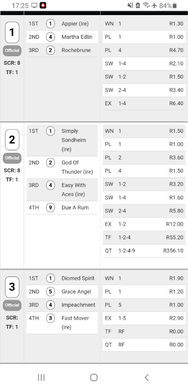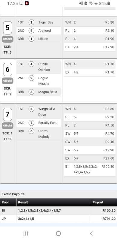 I have come to an assumption that these bets are now based on field size. In the UK there are numerous races that have 4 to 7 runner fields. If this is the reason they are yet again losing their take out of 25%. Even if they took R1000 take out for the Trifecta and Quartet per race, that is R2000 minimum for two races. On a monthly basis they are going to lose 100k profit.
