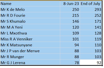 Muis up to 10th on trainers log.
