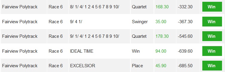 Not often I get them in a straight line with a 80-1 shot third on my software ratings and the winner on top. I threw around R50 at the problem to win around R565 rand, QAT I played roving bankers 9,1,4, F and 8,1,4, F. I played SWG 9/1,4 10x, alas I did not play the EXA which I usually play the same way but only for 5x. And I had wins on the 9 at 20-1 on WSB and places on the 80-1 shot #8 Excelsior. I obviously did not like a R824 TRI nor a R33 SWG 9/8! See ratings and winnings below with the bets I placed: