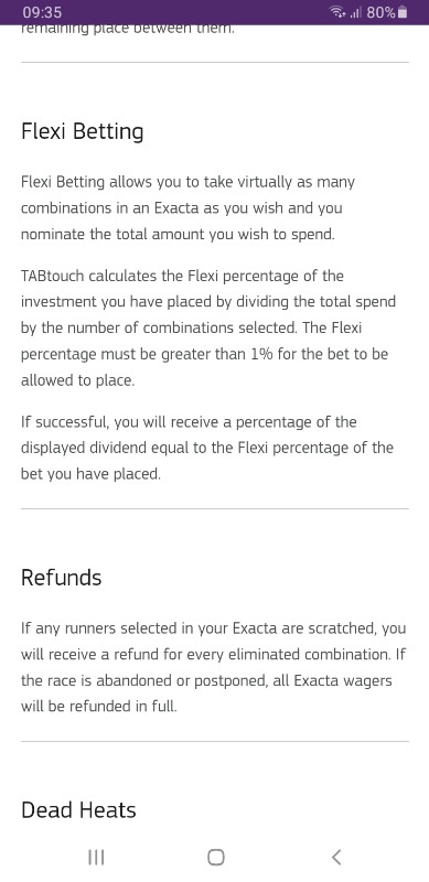 To the Tab, Australia offers percentage betting, commonly referred to Flexi betting. I have seen on social media, people catching outsider exacta below one time or like 1.4x times, etc. This is where the problem. See attached screenshot confirming you can play percentages even in their exactas.