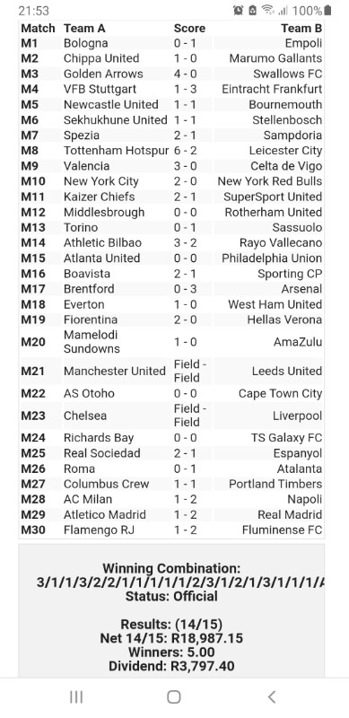 For the last 2 months, I have been playing everyday. They are selecting matches which you perceive can be a banker but the Team still draws or lose from the Soccer 6 to Soccer 13. Over the weekend they had to two certain bankers in the Any 15 as you got the field but no one won the pool of 143k. All of Spurs, Arsenal, Sundowns, Florentina won and some other good teams like Real Sociedad and Athletic Bilbao, Valencia, etc won but still no winner.