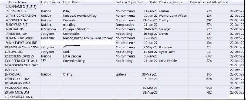 You cannot get a horse in or out of Sveld, Ashburton, Vaal, Turffontein or Randjes without security paperwork . Why is there nothing registered about these horses in and out either by security or the trainers. Hyde and Moodley blinkers on with closed cups….Once again totally ignoring their motto.