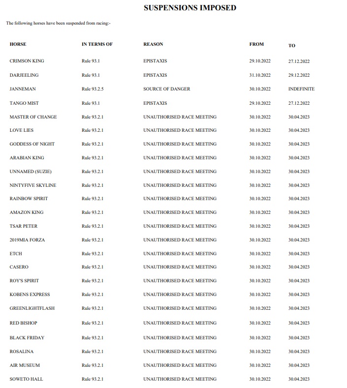 The names of horses that have been suspended have been published in the Racing Calendar, dated 4 November 2022, with additions to be published in this week’s edition.