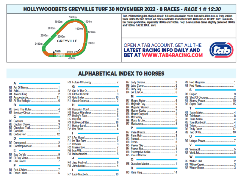 Gold Circle has taken an early decision to move the SCOTTSVILLE meeting scheduled for Wednesday 30-November-2022 to GREYVILLE Turf track (Penetrometer Reading 25) Races 4 & 5 now 1800m & Race 6 over 1600m. Kindly note First race will be off at 12:30. New Fields will be up shortly , all bets on Scottsville will be VOID