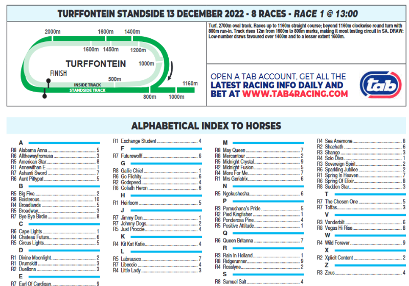Re: TURFFONTEIN TUESDAY 13 DECEMBER