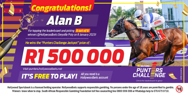 A lifetime punter won the R1 500 000 jackpot bonus in the popular free-to-enter Hollywoodbets Punters’ Challenge when he tipped all eight winners on the Hollywoodbets Greyville Polytrack on Sunday.