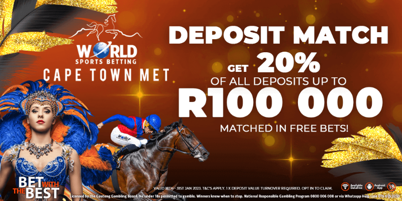 Get 20% of ALL your deposits up to R100,000 matched in Free Bets!