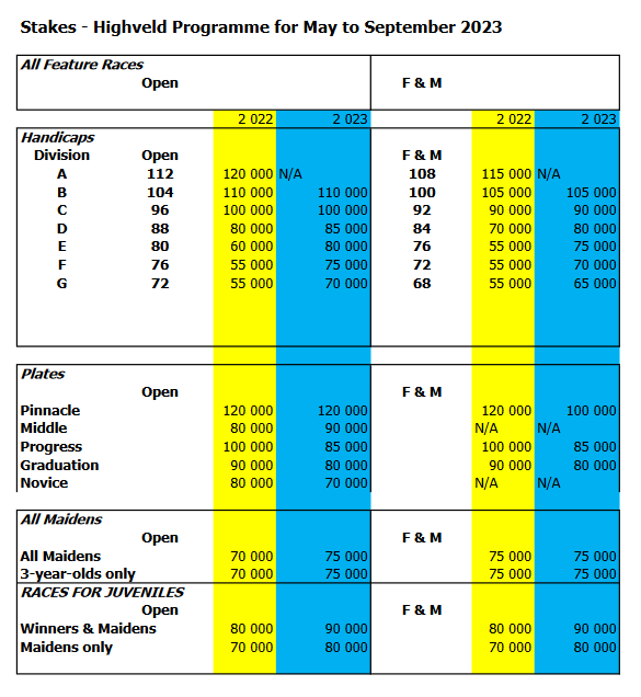 For Juveniles races, stakes have gone for Maidens only from R70 000 to R80 000 and from R80 000 to R90 000 for Winners and Maidens.