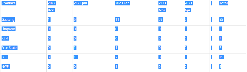 a) The table below records the reported African Horse Sickness outbreaks: summary report from December 2022 to April 2023.