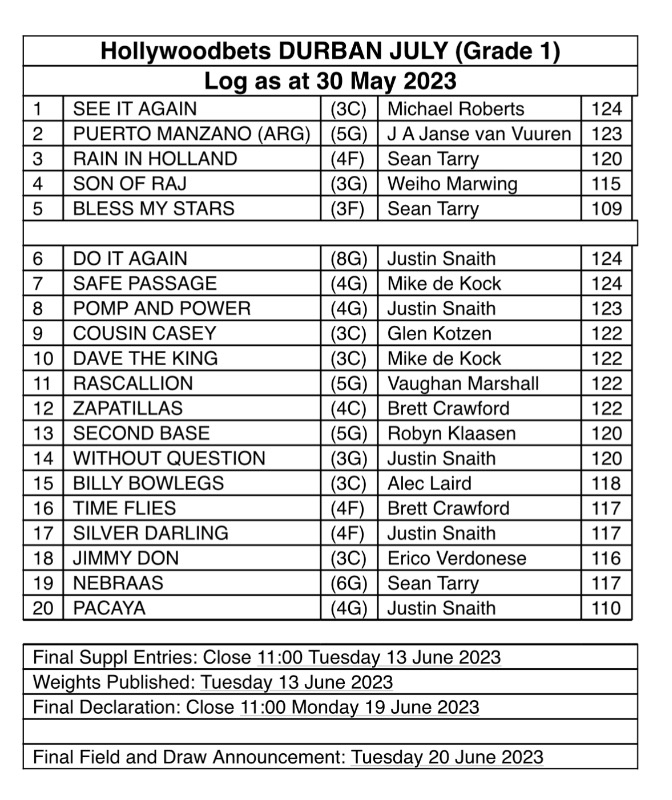 Gold Circle issued the second and final Log for the 2023 Hollywoodbets Durban July (HDJ) earlier today and there has been very little movement since the initial log went out some two weeks ago.