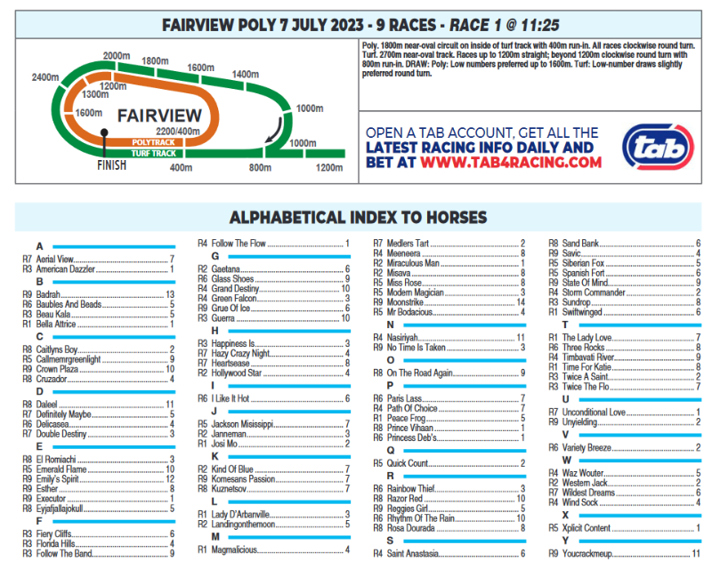 16:20 Race 09: NEXT FAIRVIEW RACEMEETING FRIDAY 14 JULY FM 66 HANDICAP (For Fillies and Mares) to be run on polytrack over a distance of approximately 1200 metres.