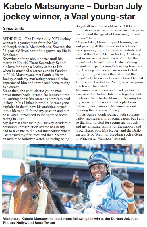 Newspaper article on winning July Jockey Kabelo M