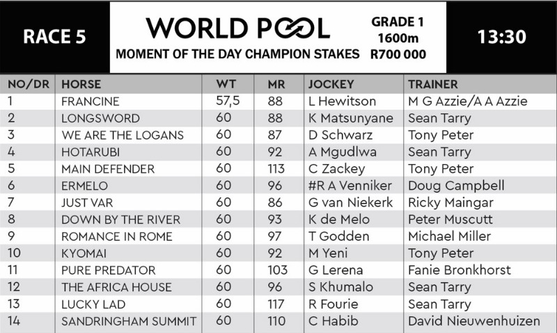In the Gr 1 World Pool Moment Of The Day Champion Stakes the top two-year-old male, the undefeated Lucky Lad, lines up and will likely have to use his exhilarating turn of foot, because he might well be dropped out from draw 13. His possible chief rival Sandringham Summit is drawn even wider in 14, but came from a mile back when winning the Gr 2 Durban Golden Horseshoe. The undefeated Main Defender could still be anything and is drawn well. Longsword, Ermelo and The Africa House are scopey, long-striding sorts who could earn cheques.