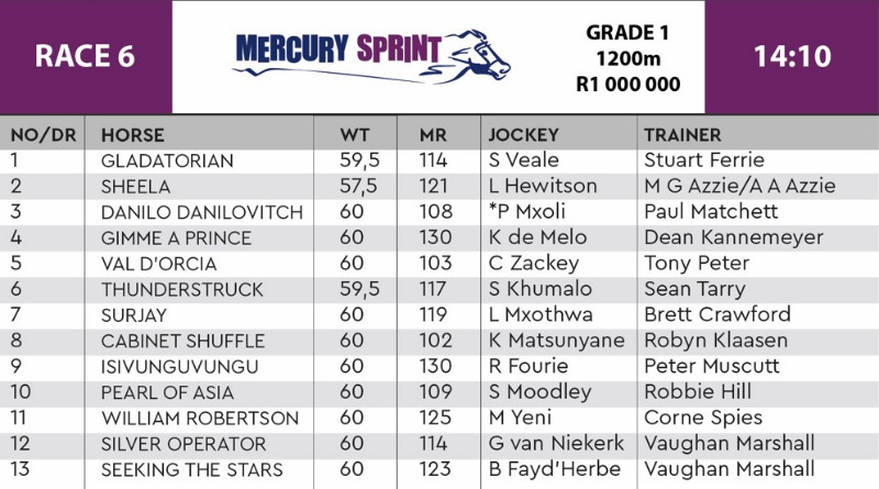 In the Gr 1 Mercury Sprint Gimme A Prince will be hard to beat from draw five over an ideal trip. Isivunguvungu is a top class sprinter too, but has to prove he is as effective over 1200m as he is over 1000m. William Robertson went close last year and is capable of winning this as he can eat up ground with his long stride. It is hard to see any of the others challenging these three. Sheela might do so though, because she has speed and a kick so should enjoy this around the turn Gr 1. Pearl Of Asia sprang a big surprise by winning this race two years ago and he can't be ignored because on his day he possesses an electrifying turn of foot, although he usually needs some luck coming from last.